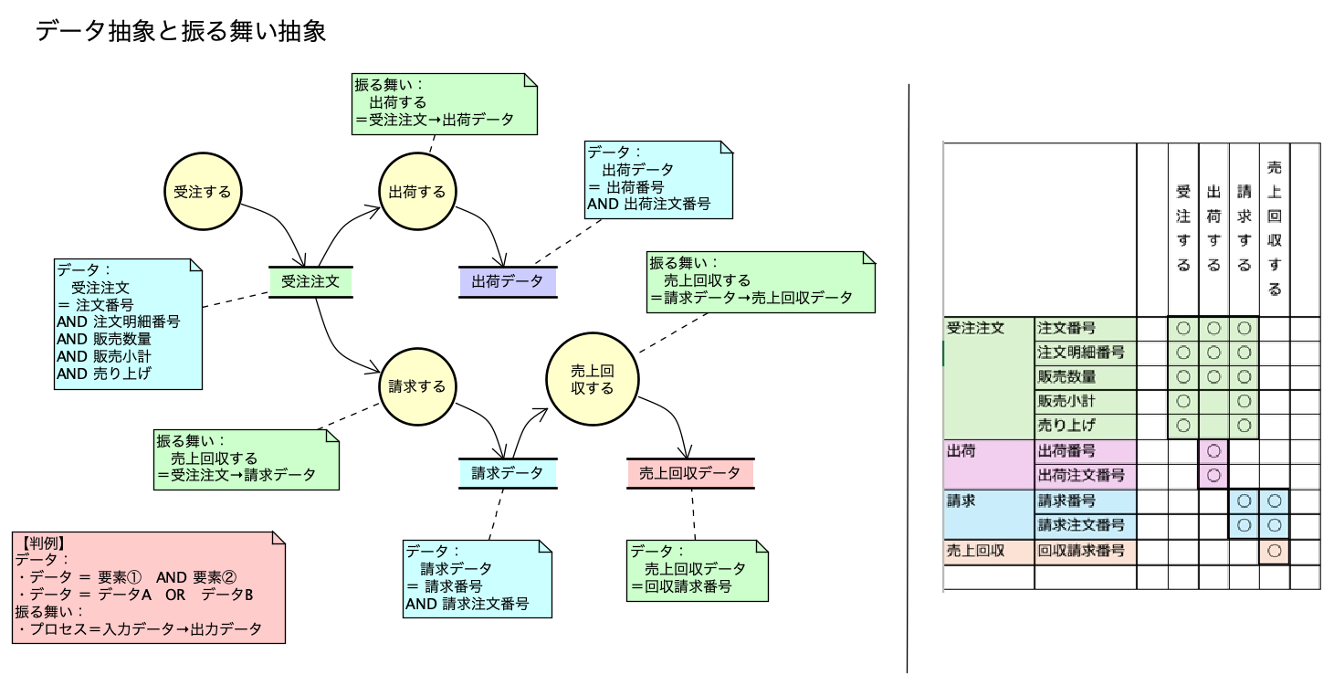 データはAND (直積) とOR (直和) による抽象で表現し、 振る舞いは 「入力データから出力データへの変換」 として整理します。これにより、 実装の詳細に依存しない、 理解しやすい仕様モデルが形成されます。